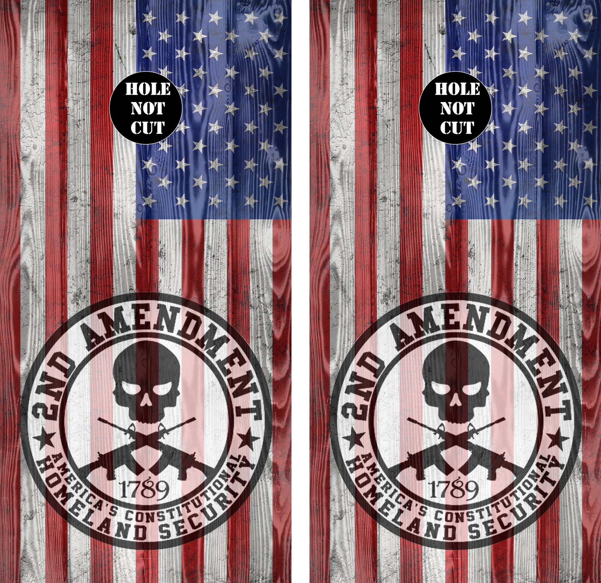 Featuring the iconic 2nd Amendment logo set against a lively, colorful American flag backdrop, these wraps don’t just cover your boards—they declare your love for liberty in style. No bland designs here; just bold colors and a message that says, “Don’t tread on my cornhole game!”