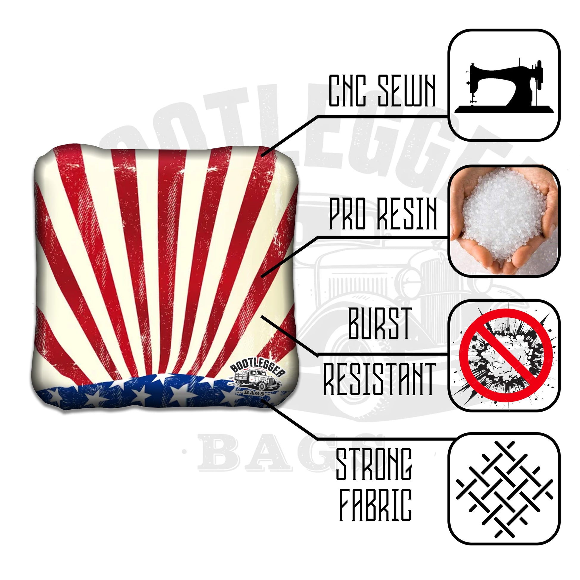 Featuring a clean, bold striped flag design, these bags deliver classic patriot style with a little extra fire. Every toss feels like a victory lap. Every bag that drops is a national achievement. Playing against someone who prefers their hot dogs boiled? Even better.