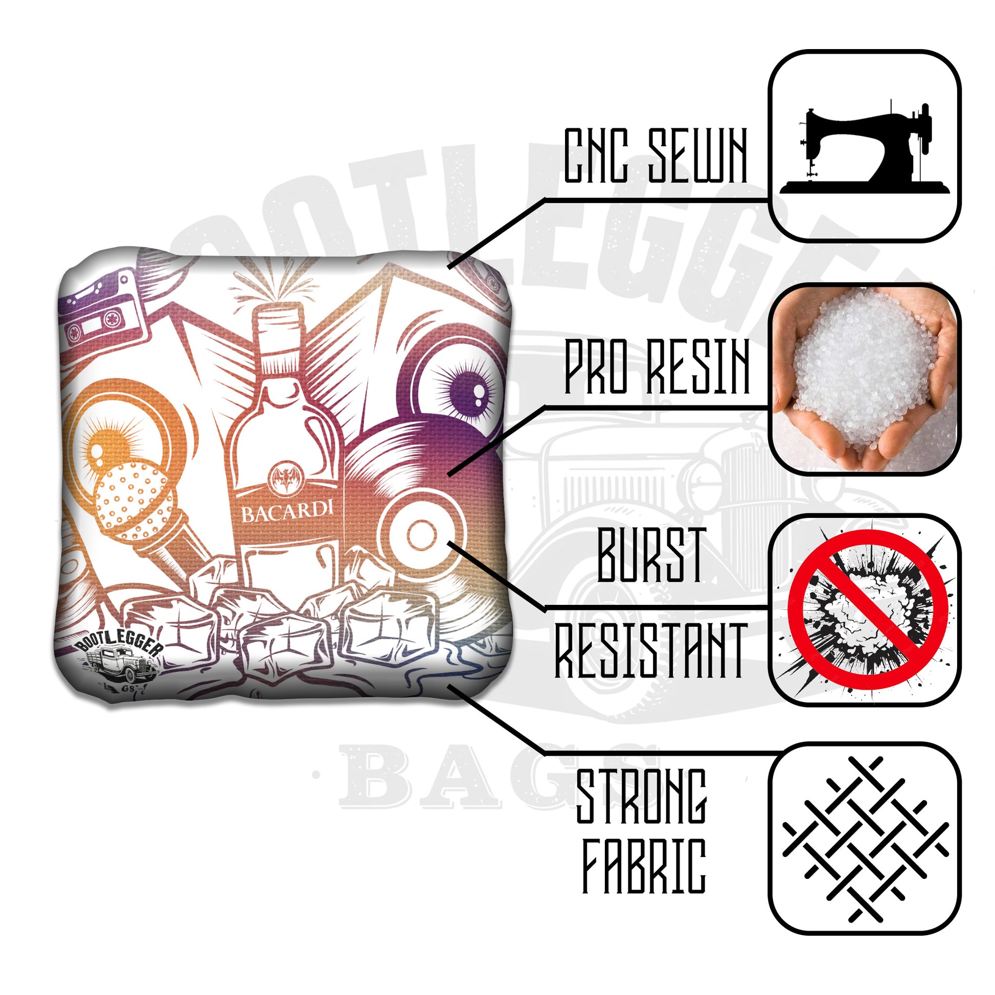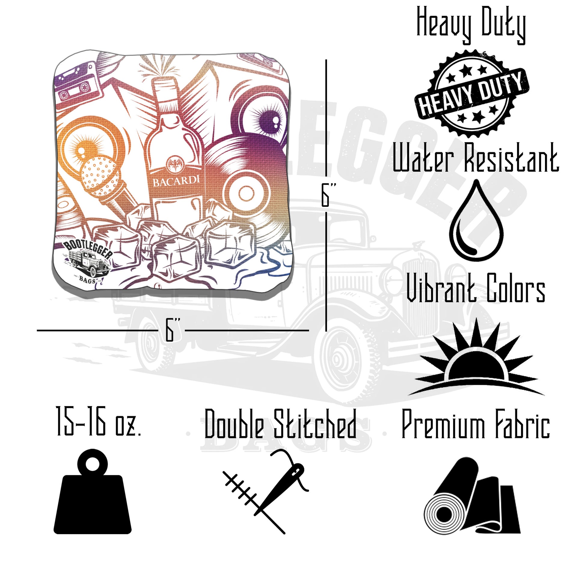 From backyard rivalries to summer nights on the patio, these Bacardi Fan Art cornhole bags deliver tropical fire and bold character on every toss.