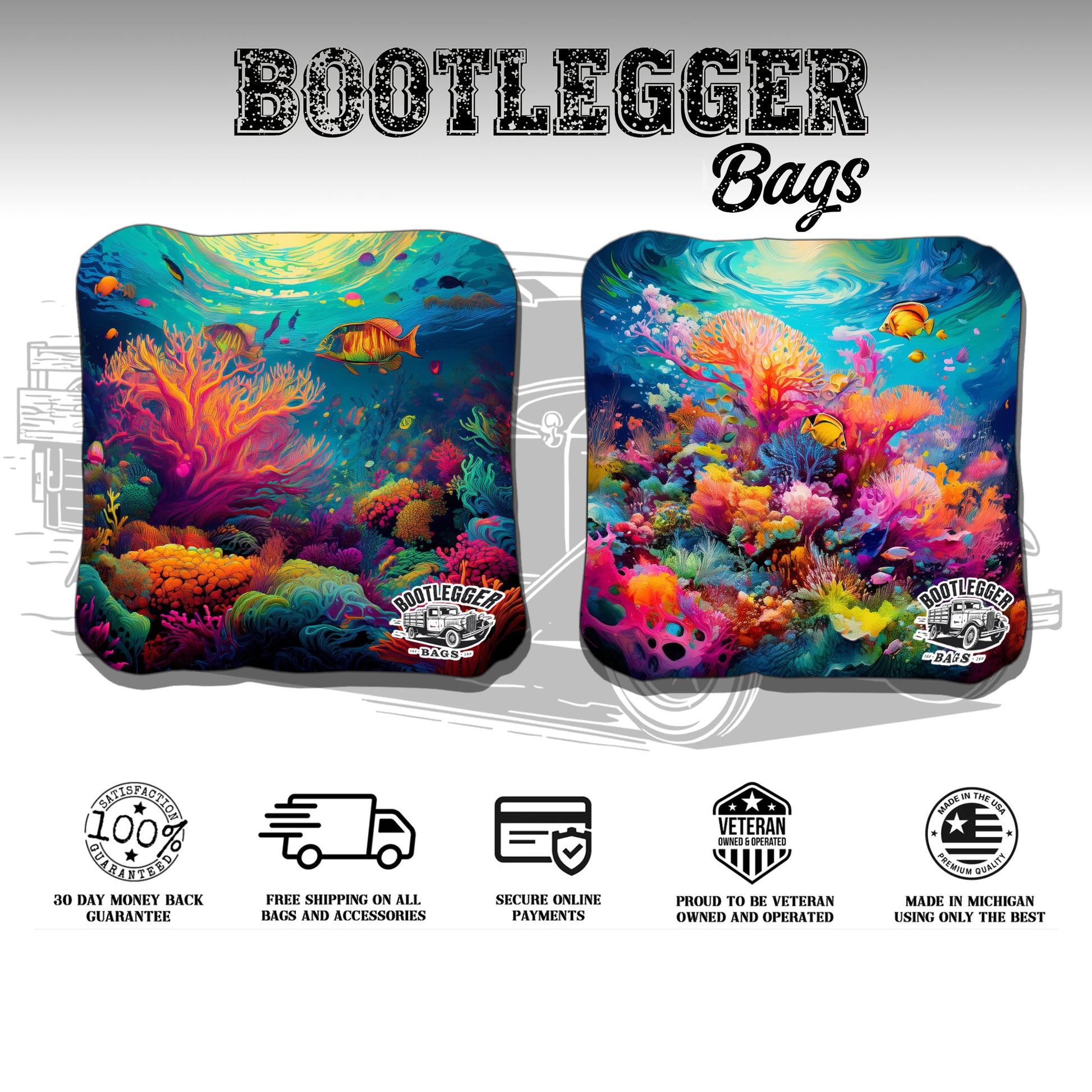 Featuring a vibrant coral reef design with striking sea-life tones, these bags give every toss a splash of underwater attitude. Each slide feels like a smooth current. Each drop in the hole lands cleaner than a diving dolphin. And if you’re playing someone who insists “all fish look the same”? Even better.