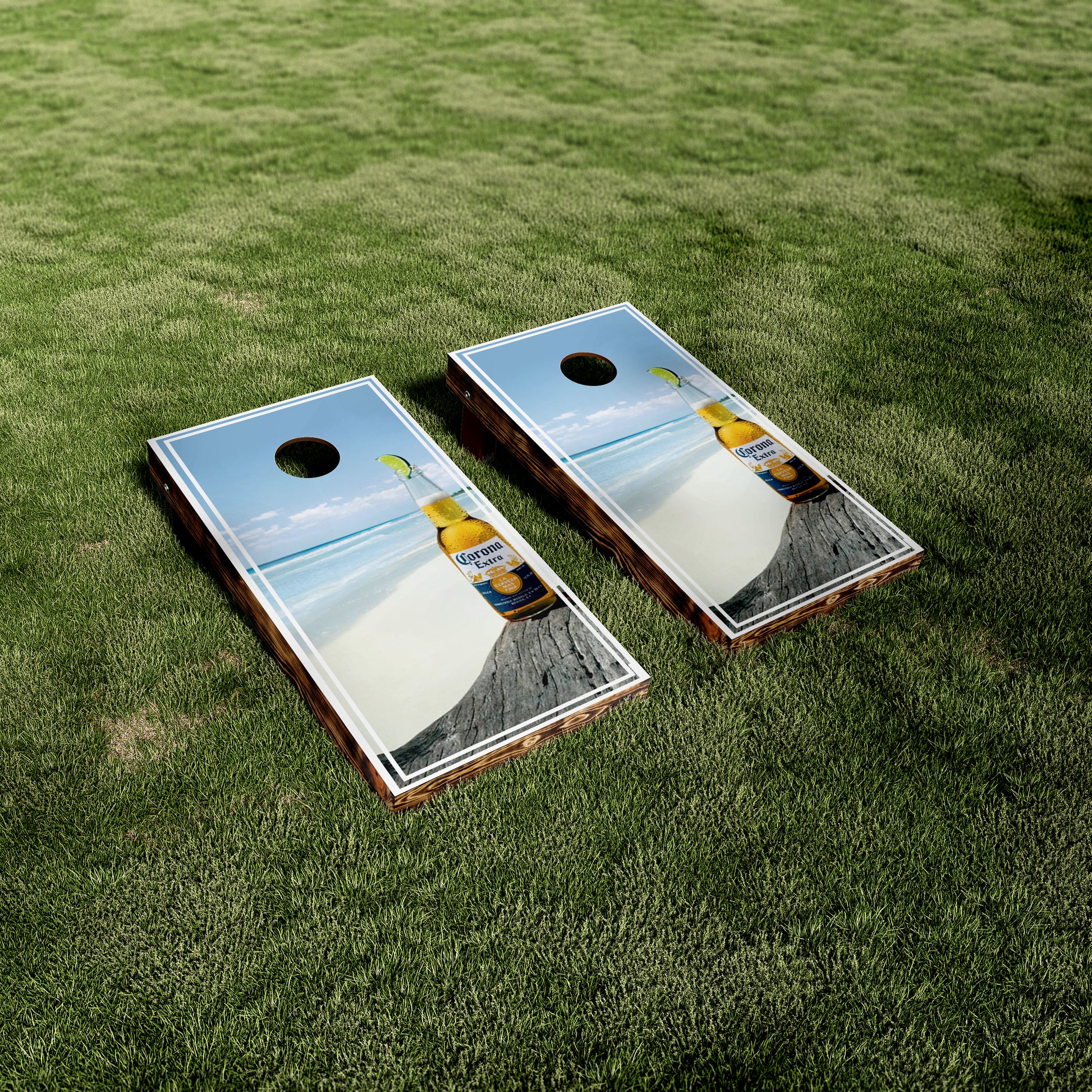 Give your cornhole boards a fresh and vibrant new look with our Corona Bottle Beach Printed Vinyl Wraps. Perfect for rejuvenating old boards or customizing a new set, these premium wraps add a touch of tropical paradise to your game. Featuring a stunning Corona bottle and beach scene, they bring a lively and eye-catching design that’s sure to impress at any gathering.