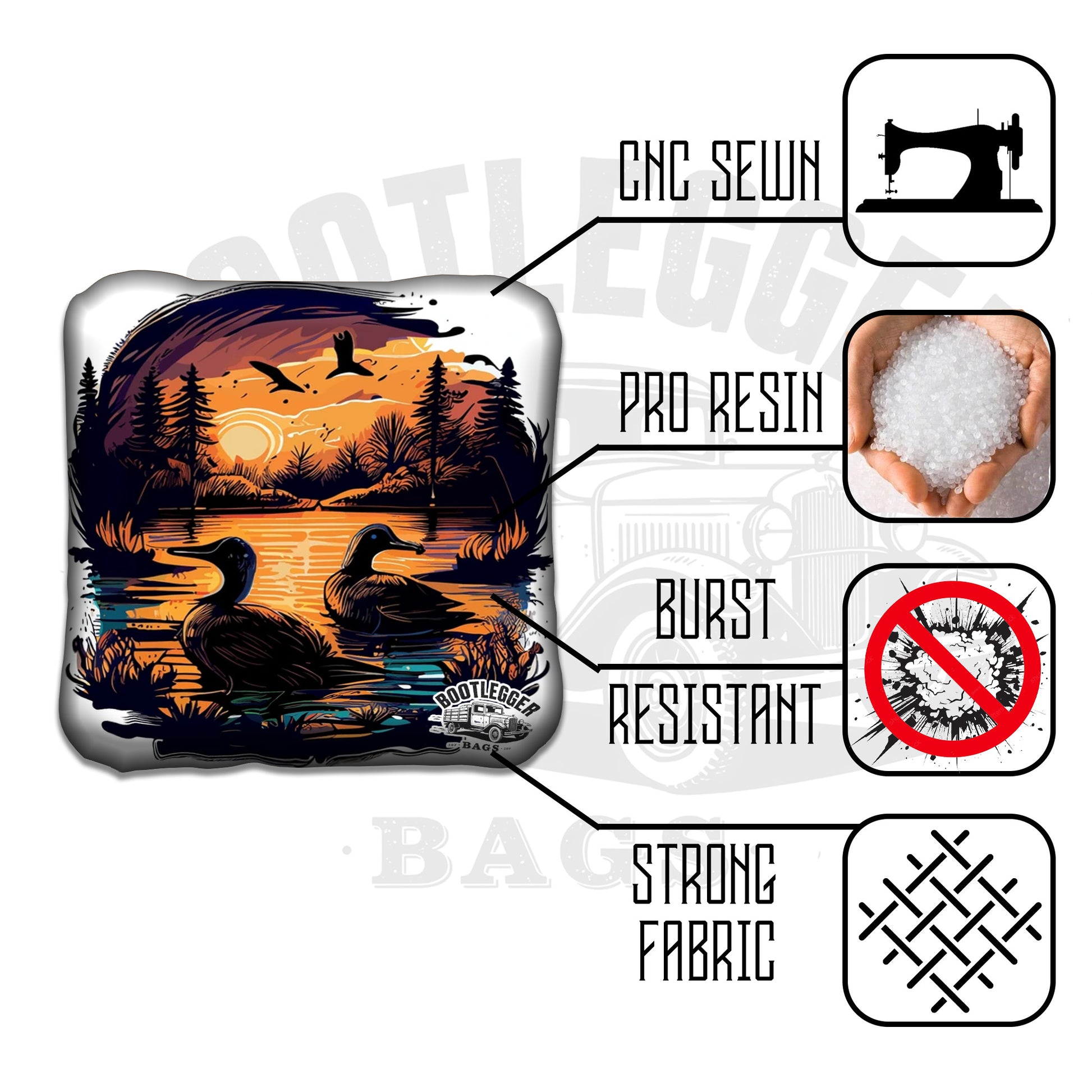 Featuring detailed duck silhouettes over a classic red, white, and blue flag background, these bags combine hunting spirit with patriotic flair. Every toss is a shot worth celebrating, and every bag that lands in the hole is like a trophy from the field.