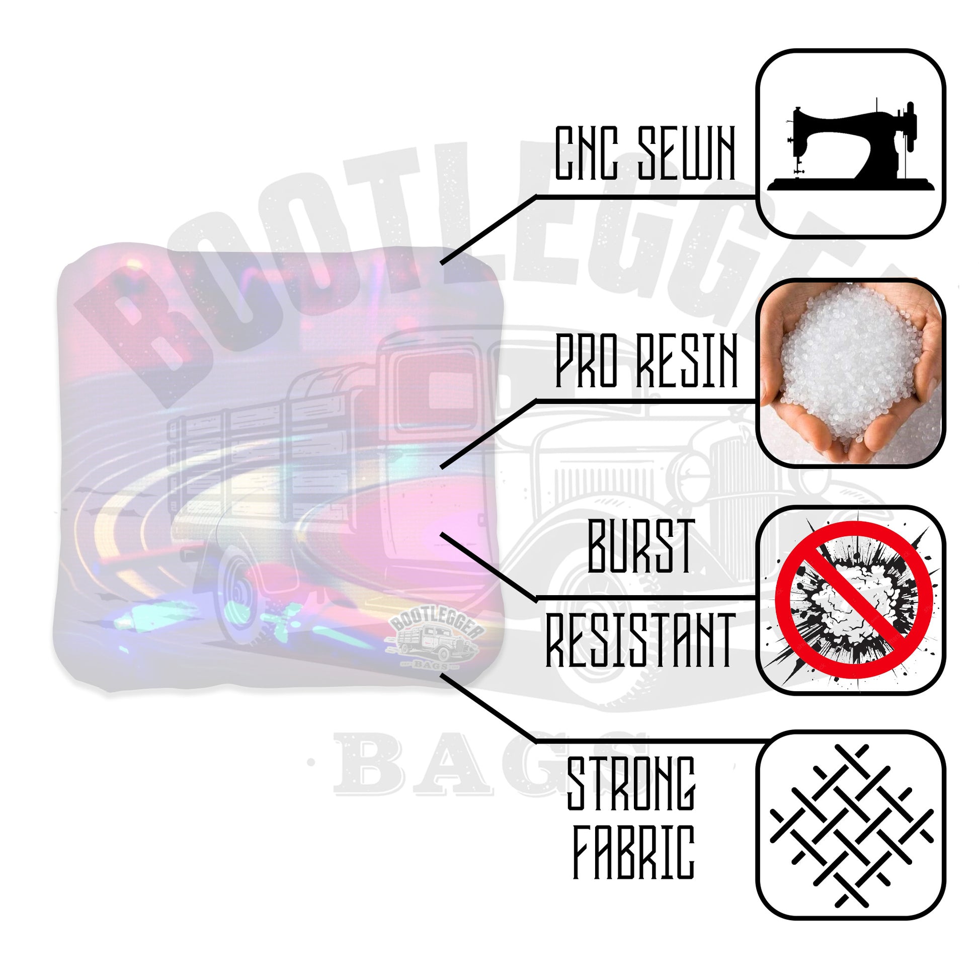 Featuring a bold electronic-themed design inspired by festival nights, bass drops, and glowing stage lights, these bags turn every toss into its own soundtrack. Every throw feels like a build-up. Every slide is a clean beat drop. Playing against someone who insists electronic music is “just noise”? Even better.