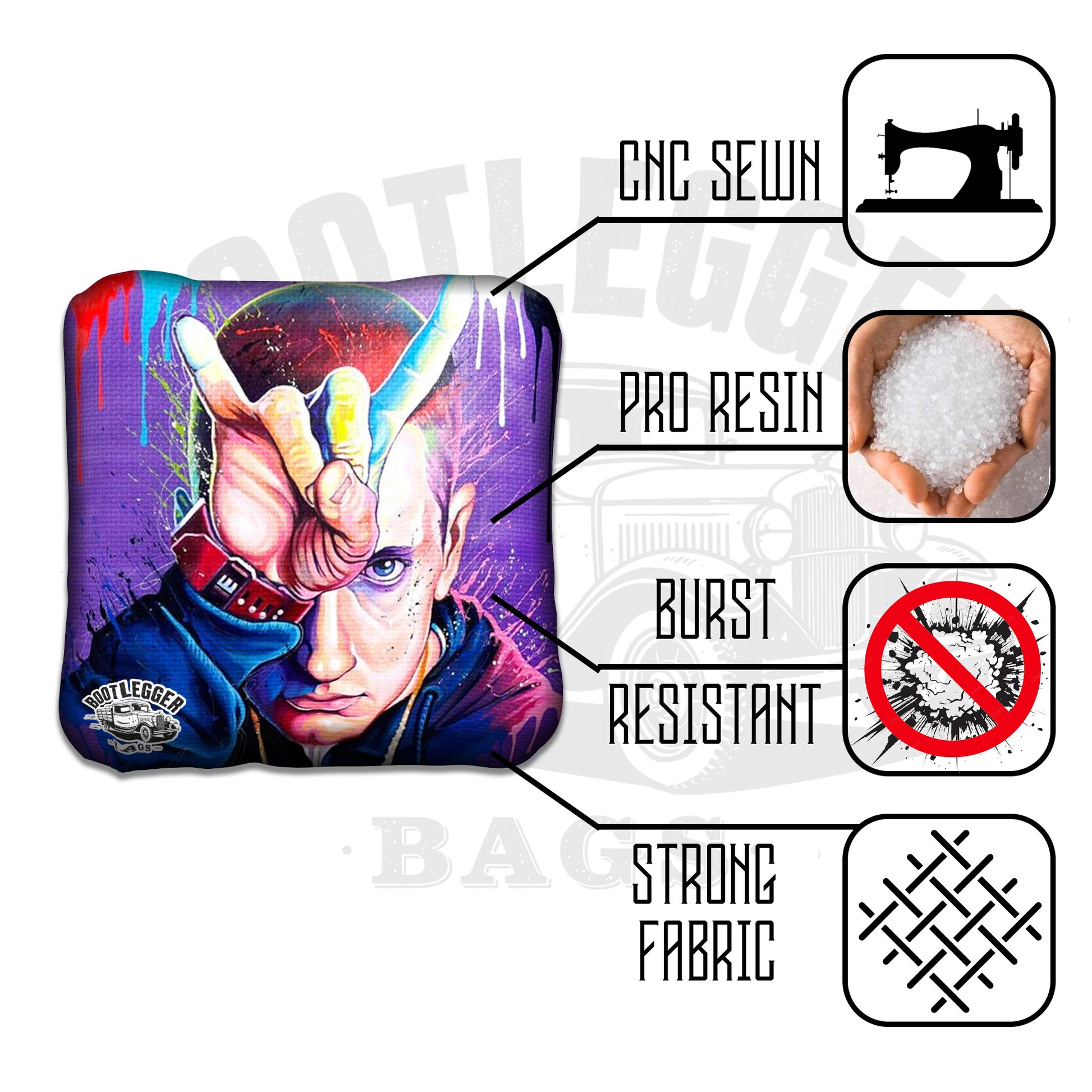 From backyard battles to tailgate throwdowns, these bags bring the energy, grit, and attitude of Detroit’s most iconic artist to every single toss.
