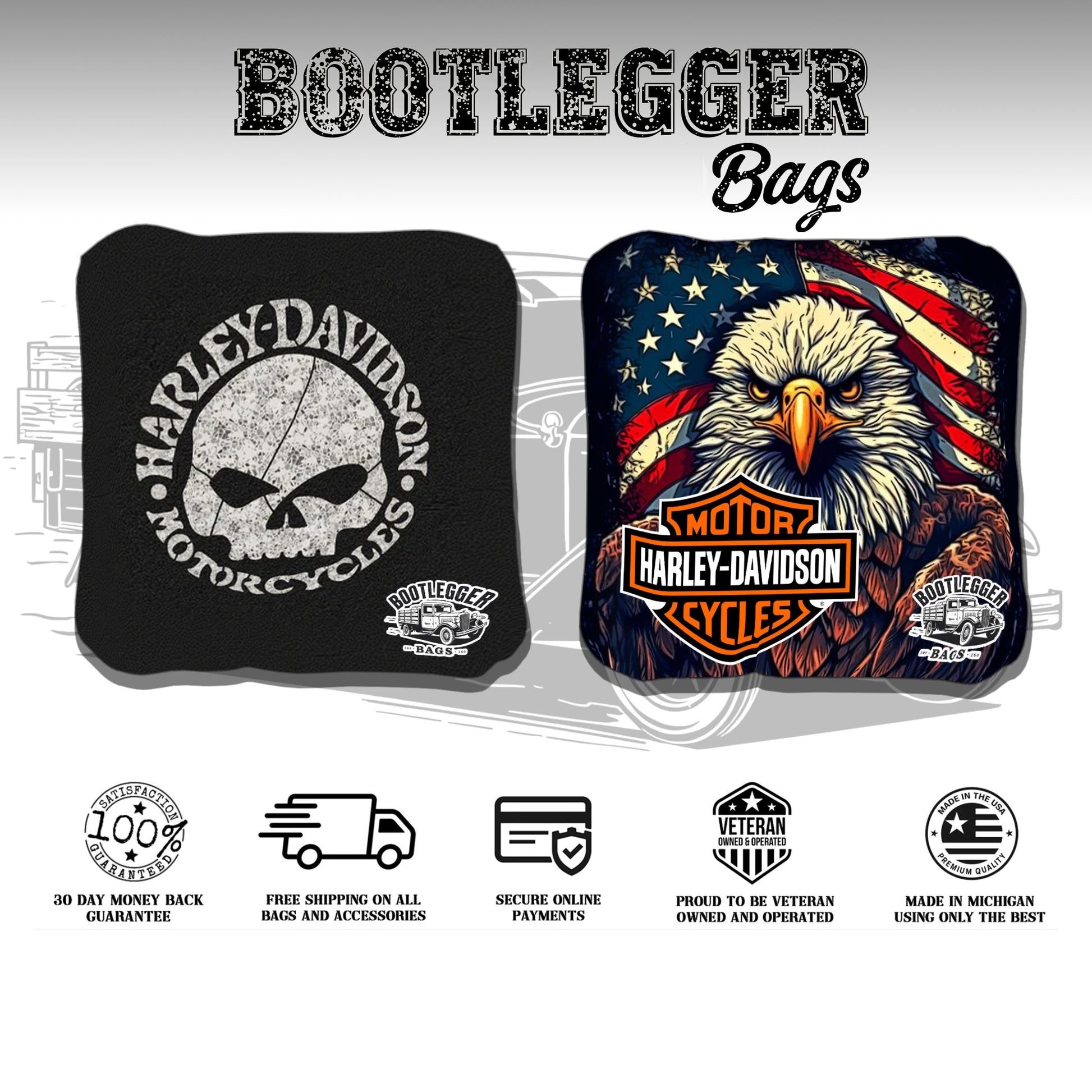From backyard tailgates to road trip pit stops, these bags bring Harley spirit and eagle strength to every toss.
