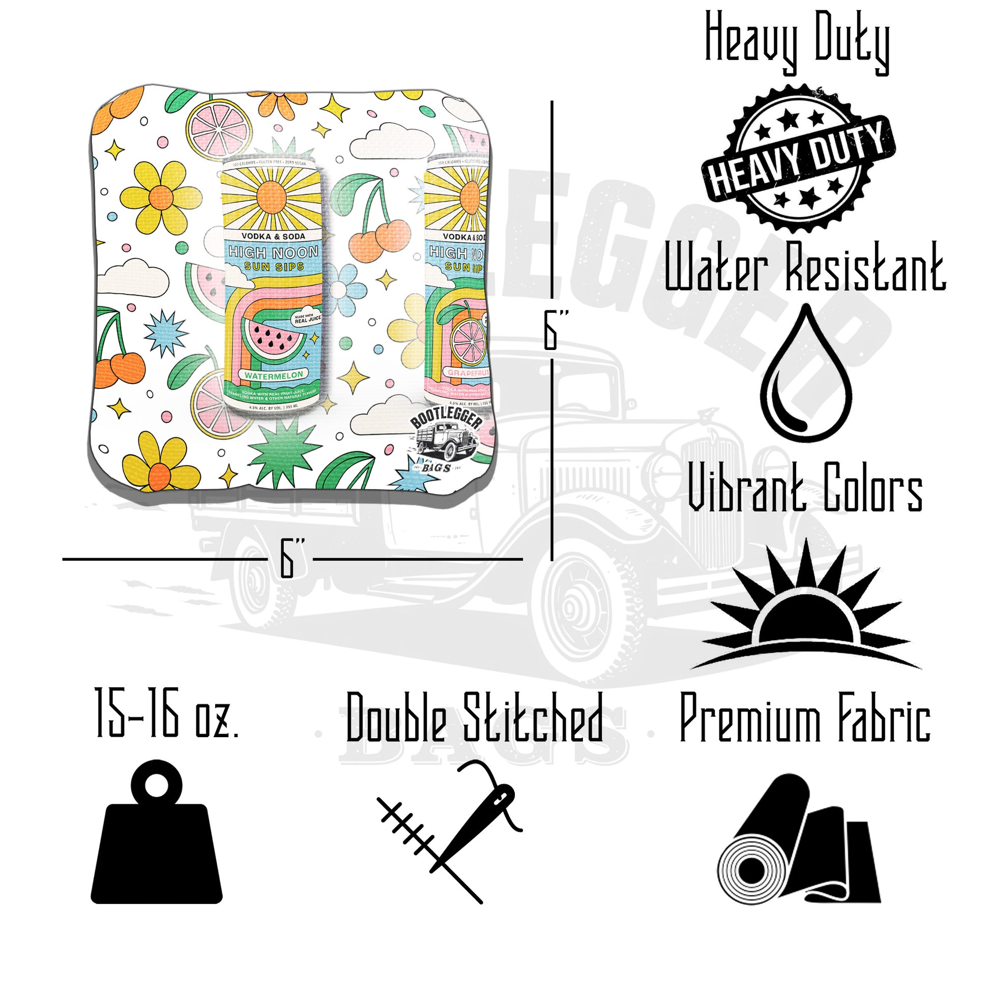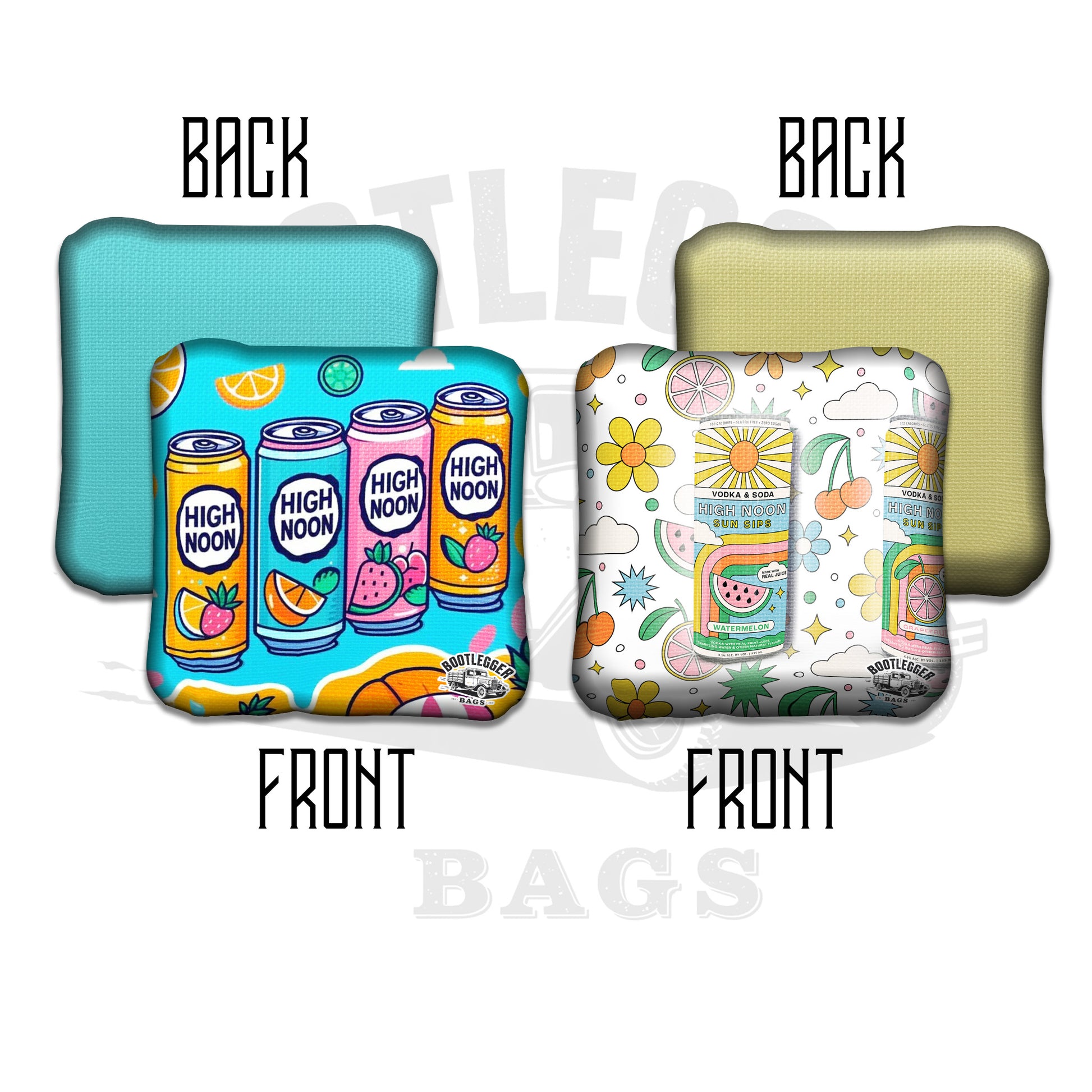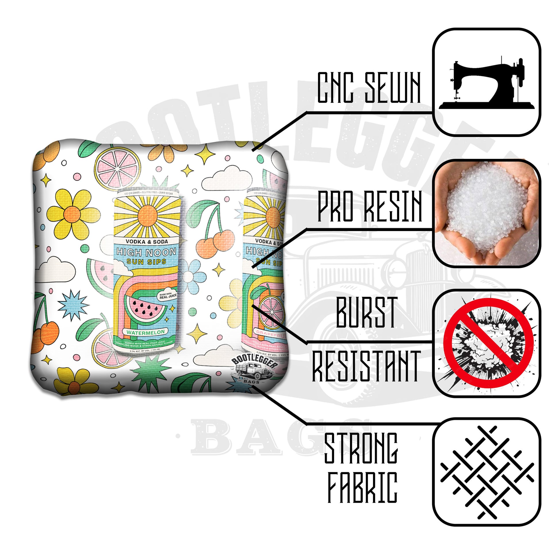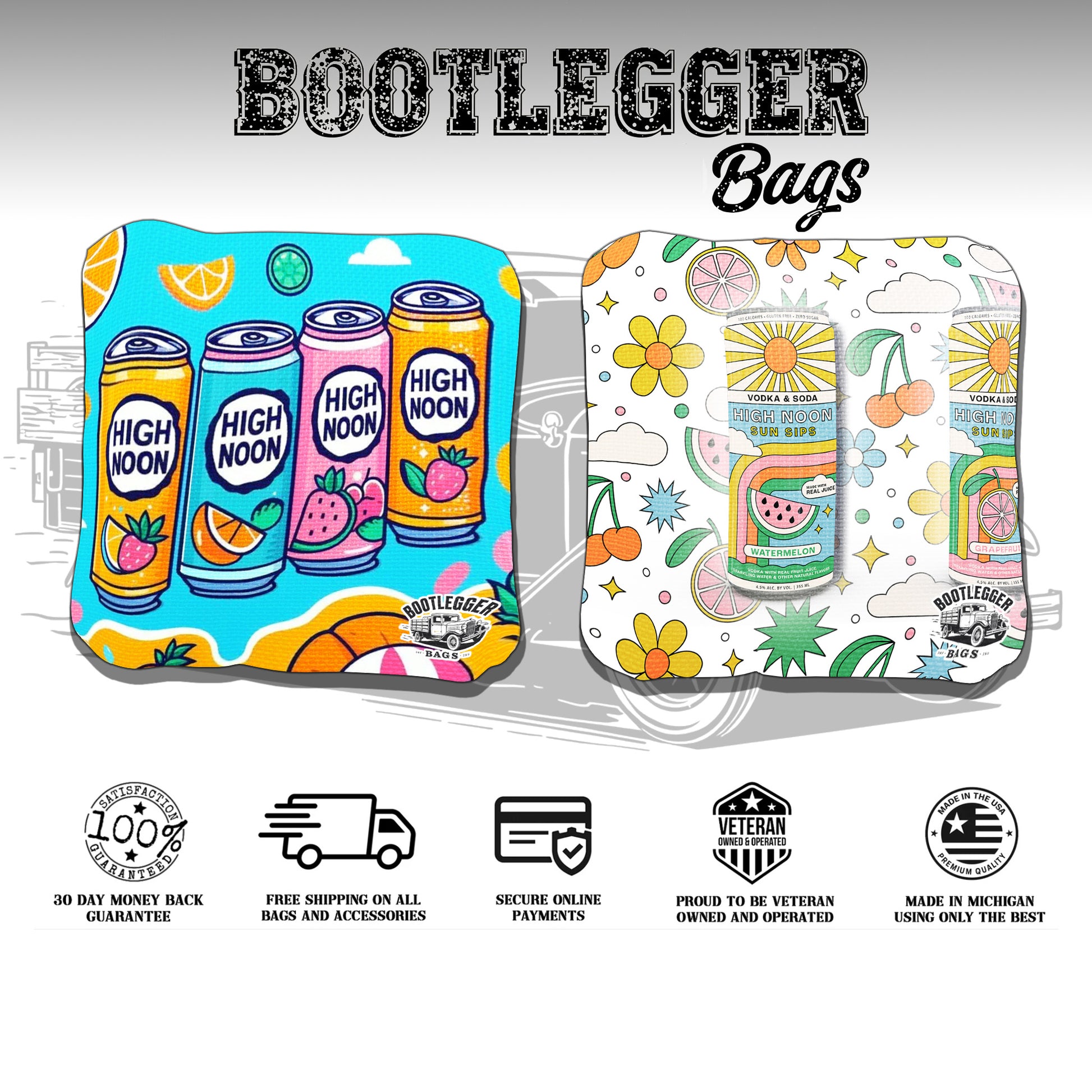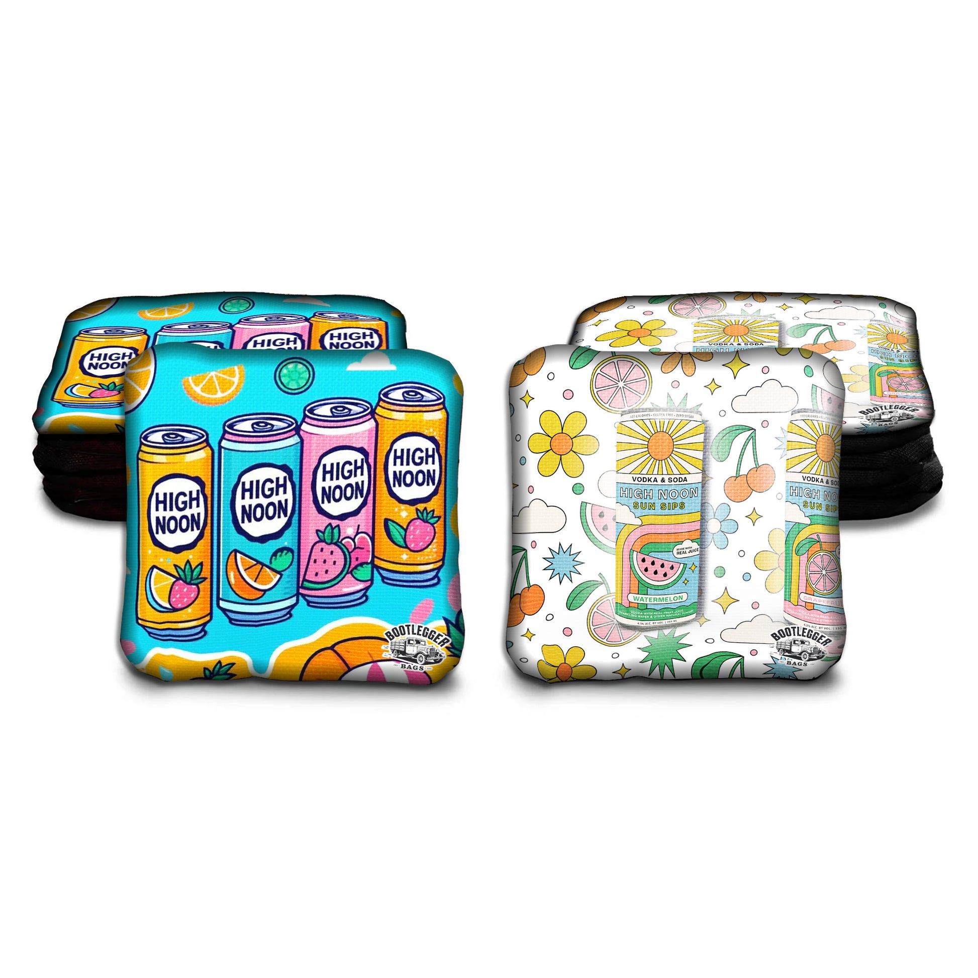 Featuring a design inspired by the iconic High Noon brand, these bags blend vibrant colors and bold graphics for a look as bright and lively as your favorite hard seltzer. Every toss is crisp, every bag lands with precision, and every backyard showdown feels like golden hour.