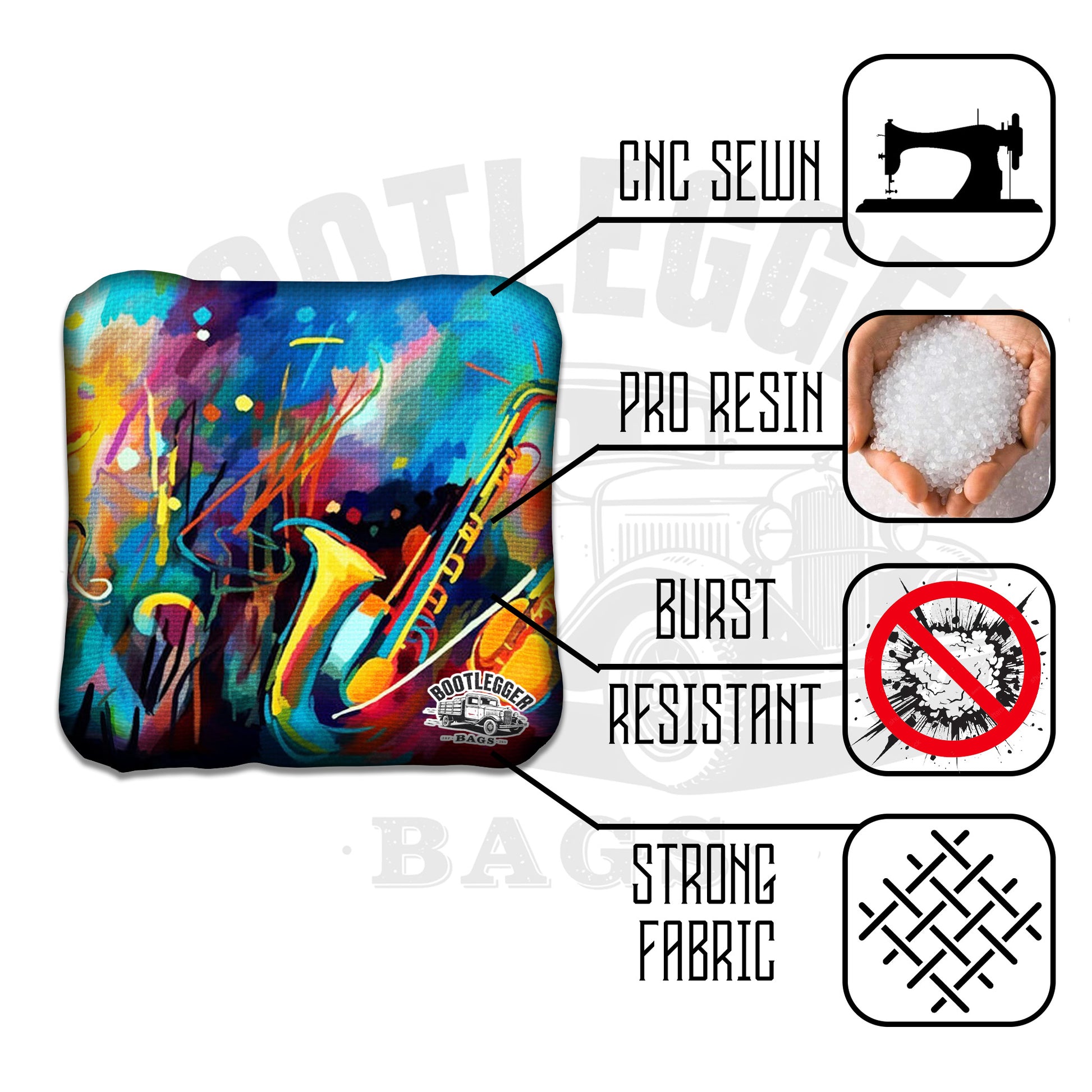 Featuring rich, artistic jazz-inspired designs—saxophones, trumpets, upright bass, flowing colors, and that unmistakable cool—each bag delivers a toss that feels like a perfect solo. Every slide is smooth. Every drop is intentional. Playing against someone with no rhythm? That’s just part of the fun.