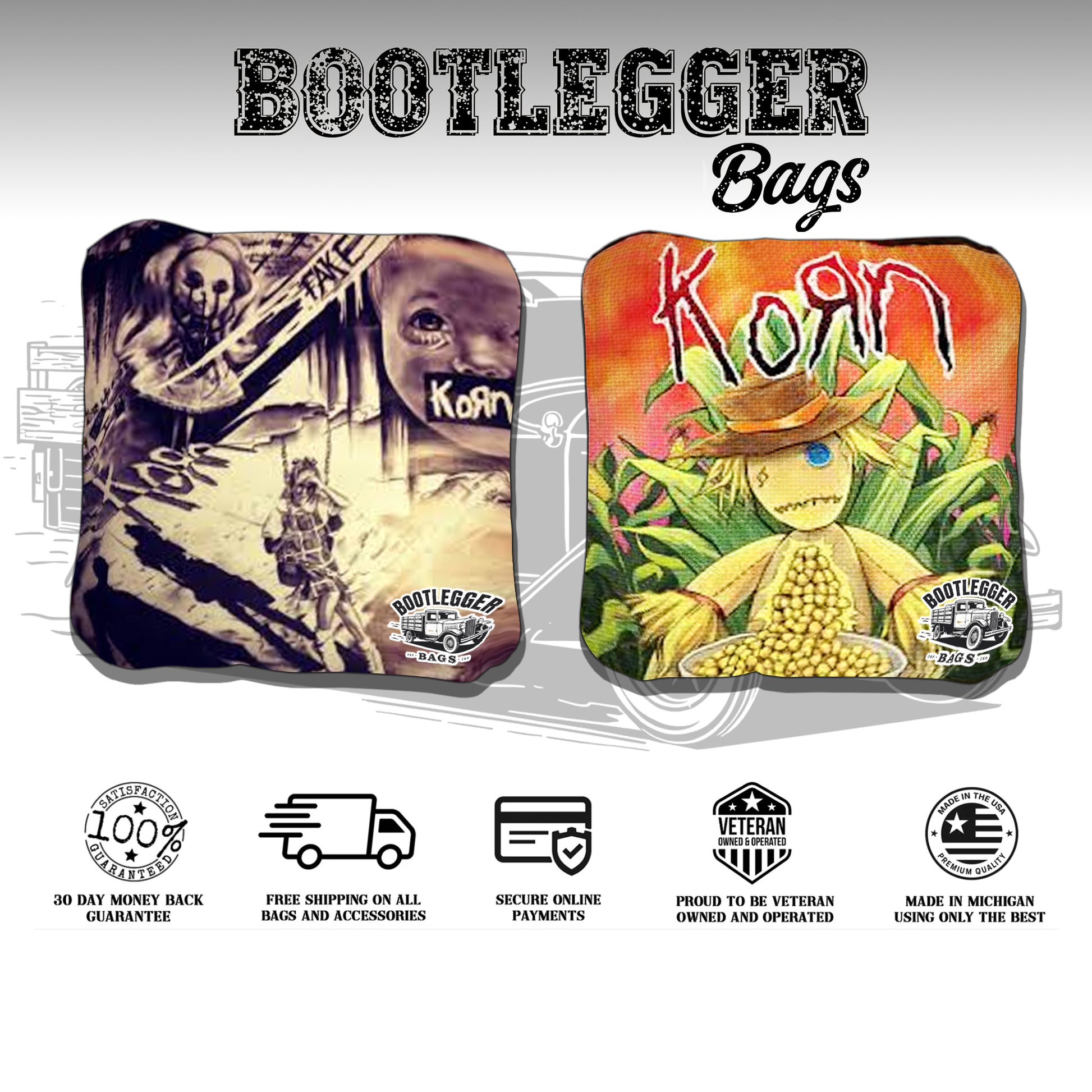 Featuring fan-art style graphics inspired by Korn’s signature raw aesthetic, these bags channel everything from on-stage chaos to album-cover darkness. Every toss hits with the same energy as a down-tuned riff. Every bag drops like a bassline in “Freak on a Leash.” Playing against someone who thinks nu-metal peaked in the '90s? Even better.