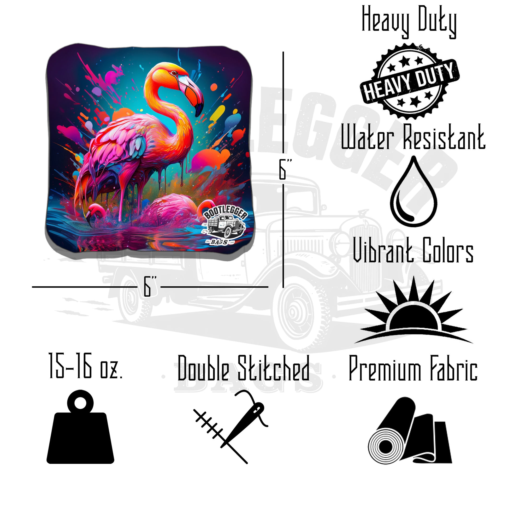 Featuring watercolor-style parrots and flamingos in bold, painterly hues, these bags offer a blend of tropical charm and creative expression. Every toss glides like a flamingo on a calm lagoon. Every slide into the hole pops with parrot-level confidence. And if you’re playing someone who thinks tropical birds are “too loud”? Even better.