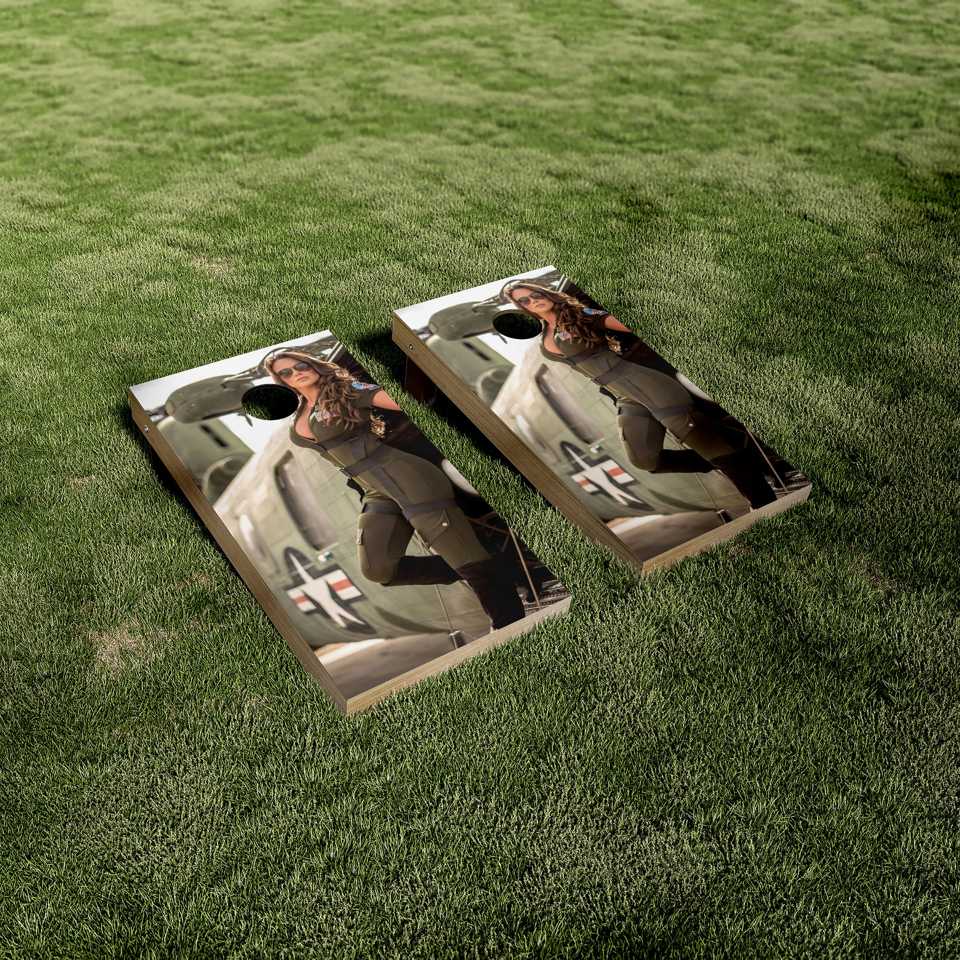 Featuring a cheeky pinup model rocking a retro flight suit, complete with helicopter patches and pilot flair, this design is ready to make your boards the runway star of any tailgate or BBQ. Whether you’re in full throttle game mode or just hanging out on the tarmac (aka the backyard), your boards will be flying high.