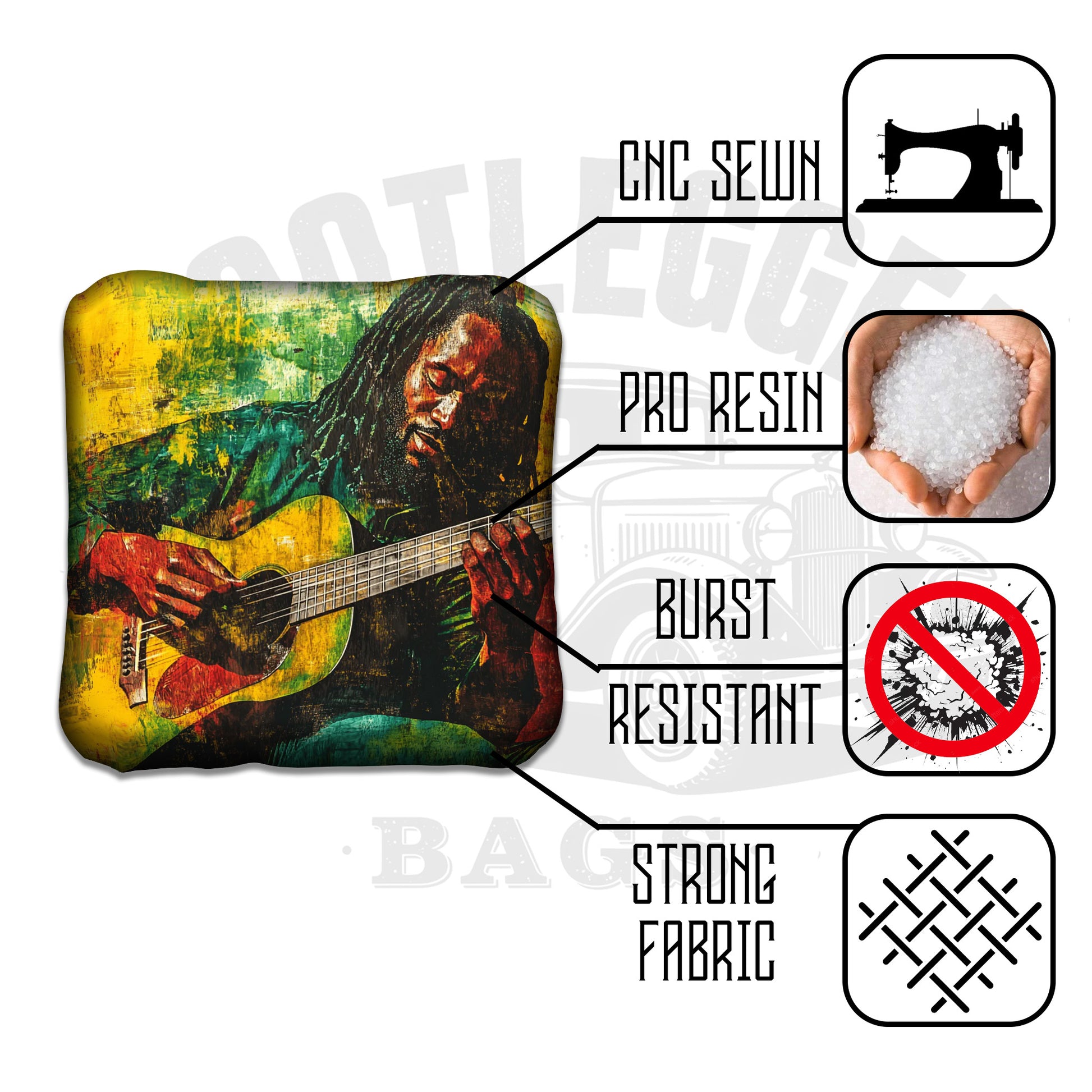 Featuring a vibrant blend of Rasta-inspired colors and mellow island energy, these bags turn every toss into a chill groove. No matter who you’re playing—family, friends, or that one neighbor who insists Marley “only had two good songs”—you’ll still bring the heat.