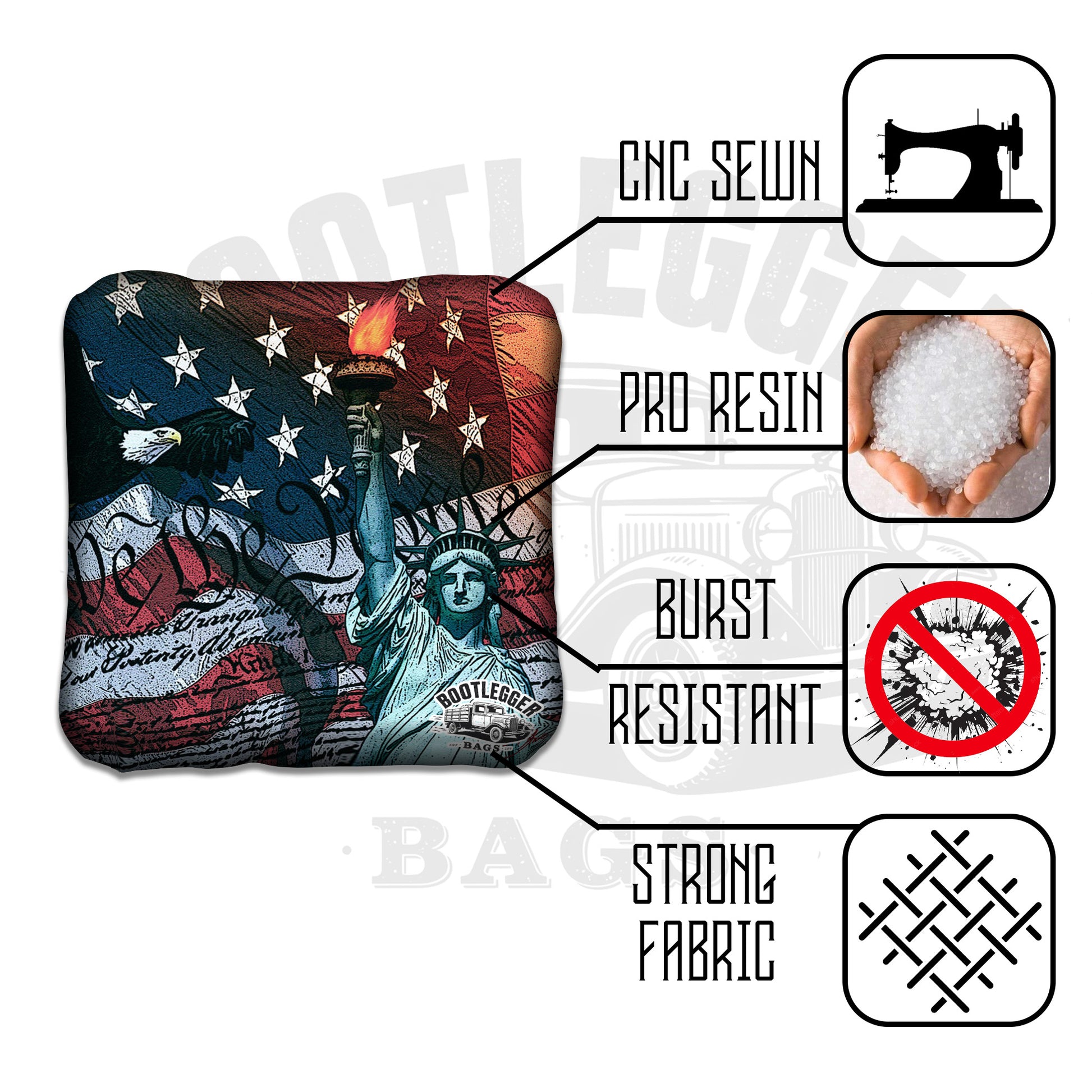 Featuring Lady Liberty herself standing tall over the We the People script, these bags mix classic patriotism with bold visuals that speak for themselves. Every toss feels like ringing the Liberty Bell. Every slide into the hole is a victory for freedom. Playing against someone who forgot the words to the Pledge? Even better.