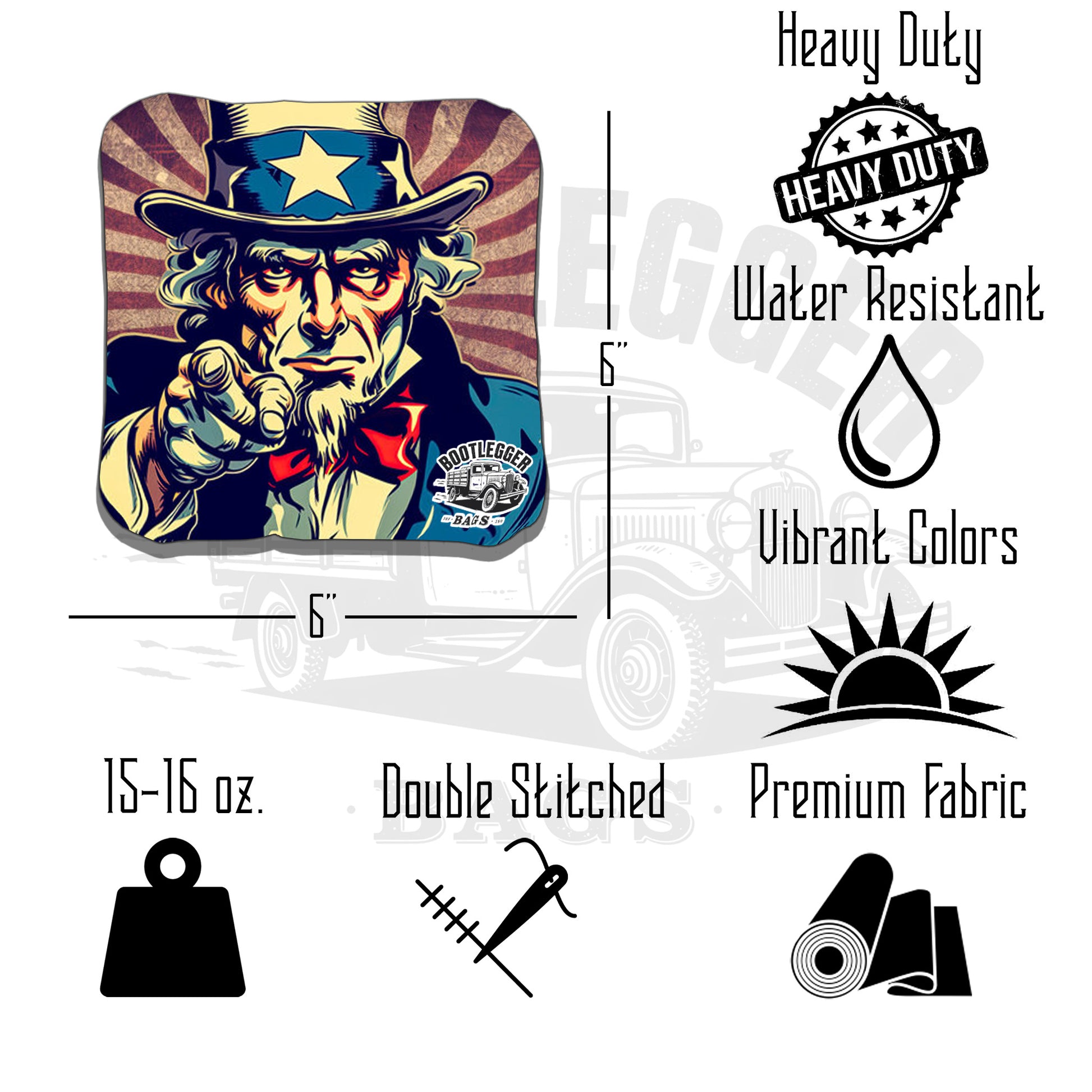Featuring a striking Uncle Sam design layered over a proud American flag backdrop, these bags deliver classic Americana with that unmistakable “I Want YOU to sink this shot” attitude. Every toss feels like a salute. Every bag that drops through the hole? Consider it a victory for freedom.
